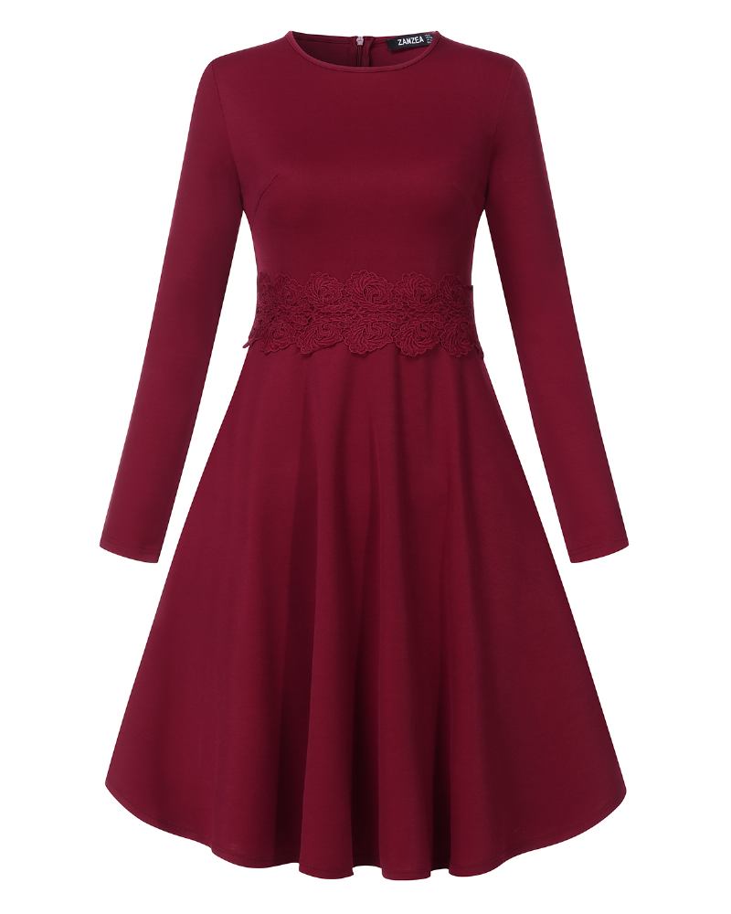 Kvinnor Elegant Långärmad Lace Patchwork Midi a Line-klänning