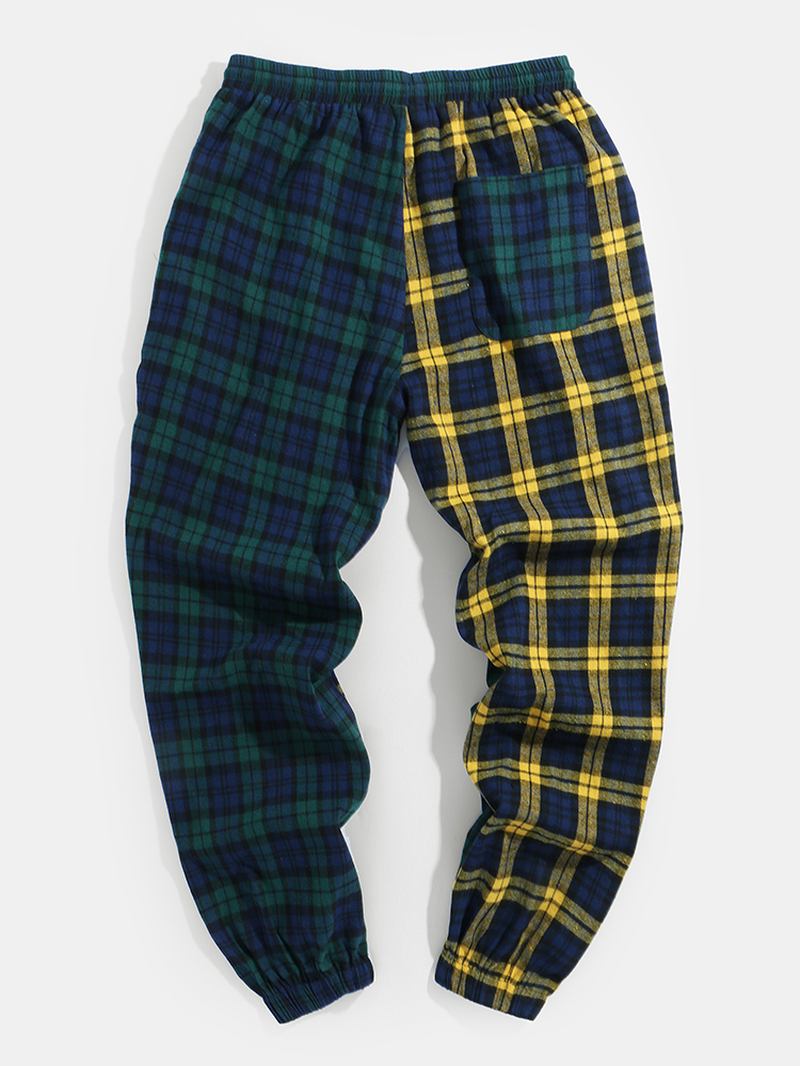 Herr 100% Bomull Kontrast Pläd Patchwork Pocket Joggerbyxor Med Dragsko