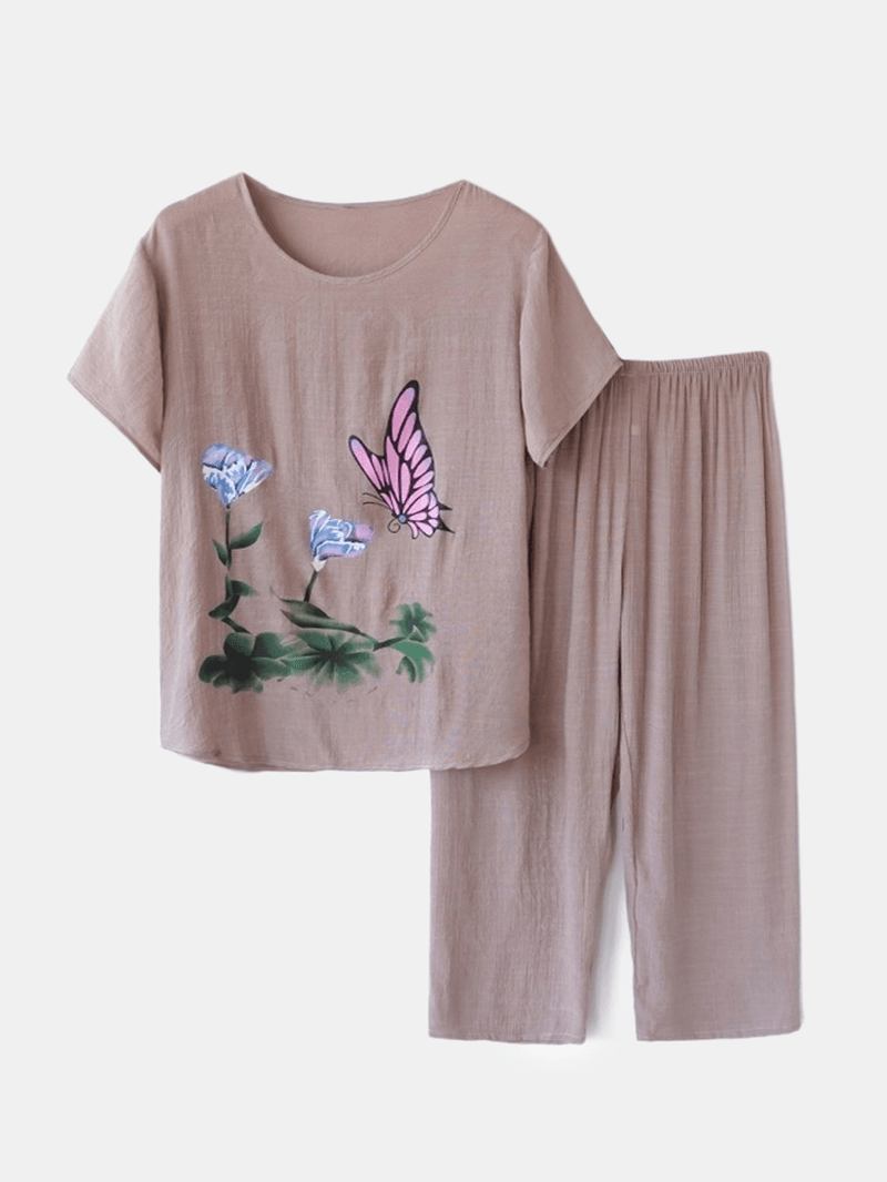 Kvinnor Butterfly Blommor Med Tryck Loungewear Lös Andas Sommarpyjamas