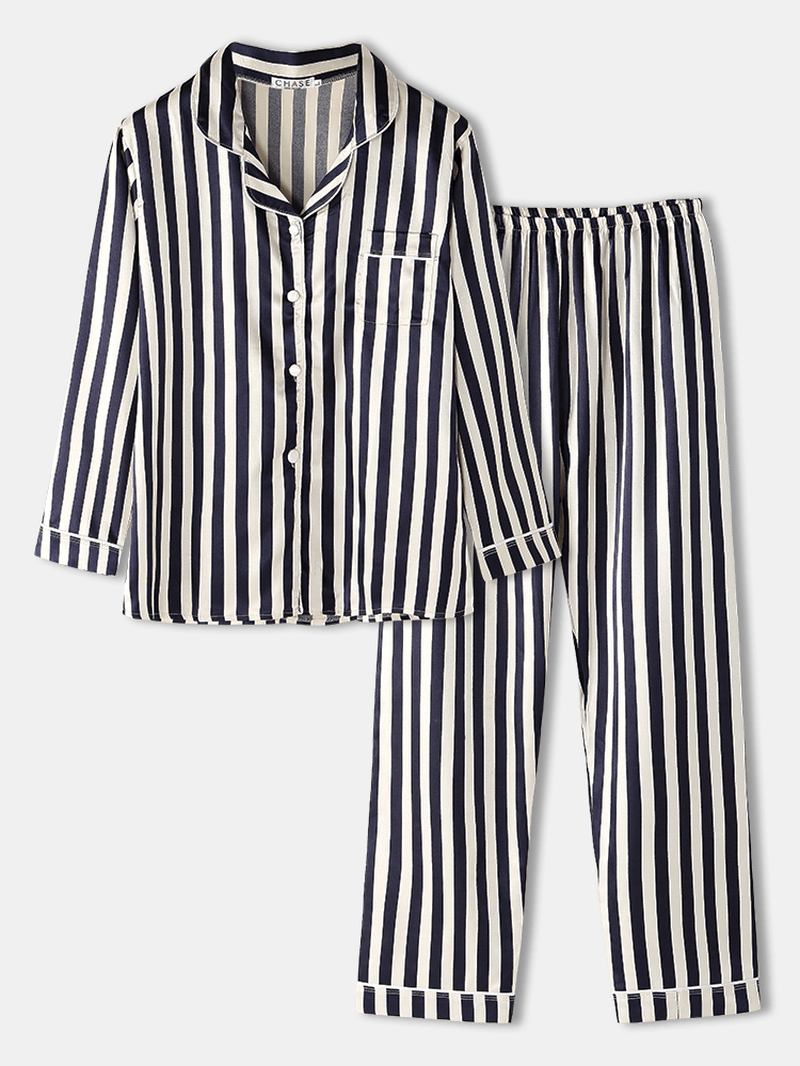 Kvinnor Randig Revere Krage Knapp Upp Långärmad Skjorta Tvådelad Pyjamasset