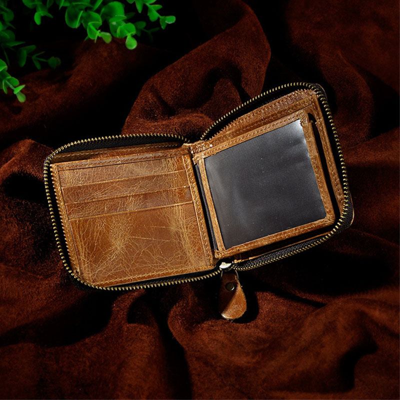 Män Äkta Läder Kohud Retro Klassisk Bifold Zipper Card Holder Plånbok