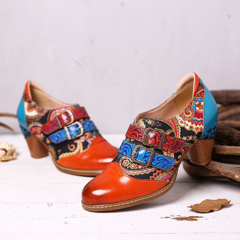 Retro Folkways Äkta Läder Med Krokögla Med Spännband Chunky Hälpumpar