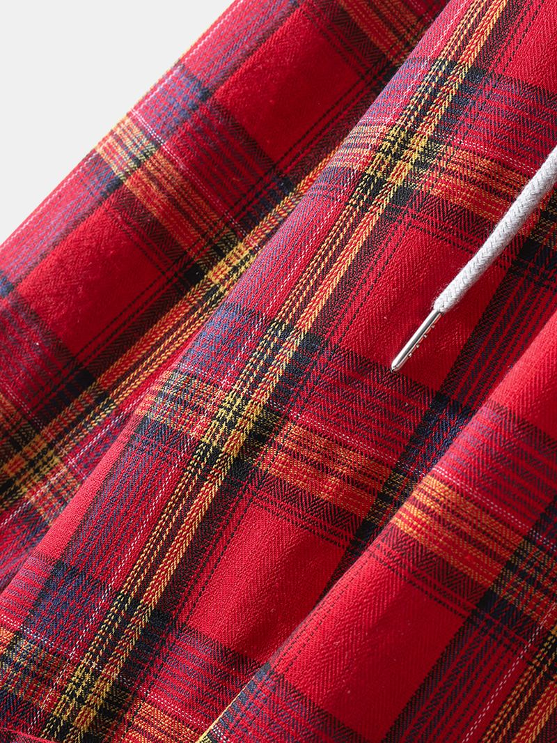 Plaid Print Patchwotk Hooded Curved Fåll Långärmade skjortor för män