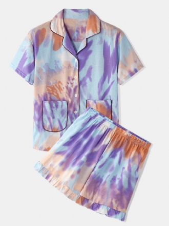 Kvinnor Tie Dye Button Up Pocket Revere Krage Kortärmad Hem Pyjamas Set
